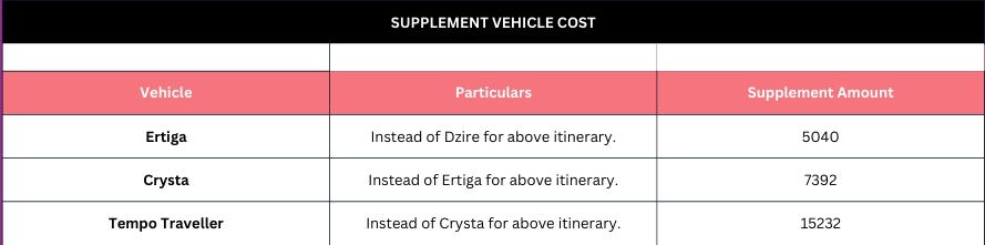 Air Fare / Train fare. Personal Expenses such as Laundry, telephone calls, tips & gratuity, mineral water, soft & hard drinks, rafting, rock climbing, paragliding and porterage. Additional sightseeing or extra usage of vehicle, other than mentioned in the itinerary. VIP Darshan in Kamakhya Temple Entrance Fees & Guide charges. Any cost arising due to natural calamities like, landslides, road blockage, political disturbances (strikes), etc (to be borne by the client, is directly payable on the spot). Any increase in taxes or fuel price, leading to increase in cost on surface transportation & land arrangements, which may come into effect prior to departure. Room Heater Charges Insurance. Anything specifically not mentioned in the ‘Cost includes’ column.