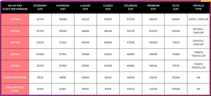 Air Fare / Train fare. Personal Expenses such as Laundry, telephone calls, tips & gratuity, mineral water, soft & hard drinks, rafting, rock climbing, paragliding and porterage. Additional sightseeing or extra usage of vehicle, other than mentioned in the itinerary. VIP Darshan in Kamakhya Temple Entrance Fees & Guide charges. Any cost arising due to natural calamities like, landslides, road blockage, political disturbances (strikes), etc (to be borne by the client, is directly payable on the spot). Any increase in taxes or fuel price, leading to increase in cost on surface transportation & land arrangements, which may come into effect prior to departure. Room Heater Charges Insurance. Anything specifically not mentioned in the ‘Cost includes’ column
