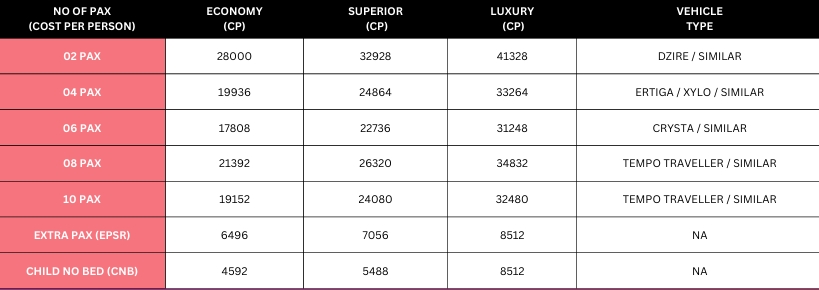 Festive or peak season surcharges (Diwali, New Year, Christmas, or long weekends) are not included unless stated.