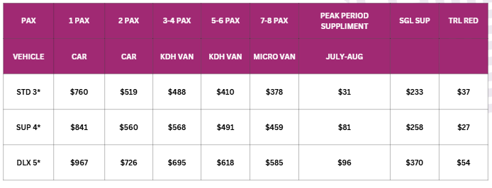Note: Hotels’ check in time 1400 hours/ check out time 1200 hours.