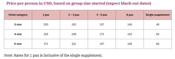 Tour guide(s) escort as per the itinerary (English-speaking guides – different guides in SIC tours)